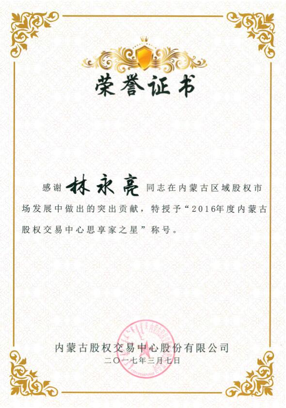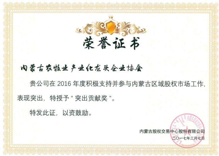 在37日上午召開的首屆內蒙古股權交易中心會員和分支機構大會上,內蒙古農牧業(yè)產業(yè)化龍頭企業(yè)協(xié)會因積極支持并參與內蒙古區(qū)域股權市場工作,榮獲內蒙古股權交易中心頒發(fā)的“突出貢獻獎”,協(xié)會執(zhí)行會長兼秘書長林永亮及常務秘書長劉俊青均榮獲“內蒙古股權交易中心思享家之星”稱號。這是對協(xié)會在2016年對內蒙古區(qū)域股權市場發(fā)展中突出貢獻的肯定,更是承載著一份責任和希望,新的一年,內蒙古農牧業(yè)產業(yè)化龍頭企業(yè)協(xié)會將繼續(xù)秉承“溝通 服務 自律 發(fā)展”的服務宗旨,乘勢而上,加壓奮進,開拓創(chuàng)新,找準協(xié)會工作與股權經濟建設的結合點,為推動農牧業(yè)產業(yè)化發(fā)展做出新的貢獻。