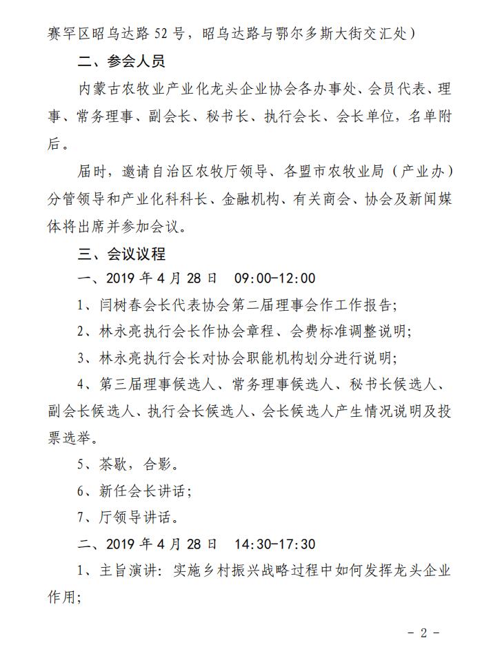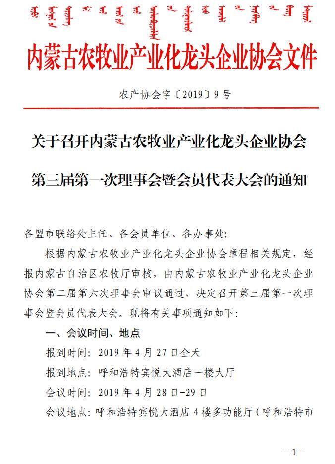 標題:關于召開內蒙古農牧業(yè)產業(yè)化龍頭企業(yè)協會第三屆第一次理事會暨會員代表大會的通知