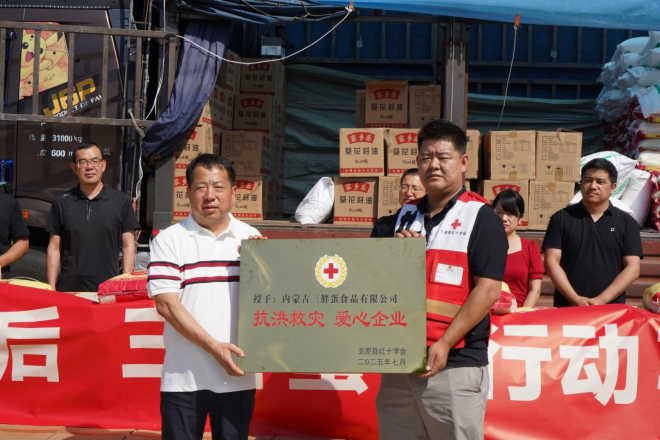 風雨突襲巴彥淖爾時,內蒙古農(nóng)牧業(yè)產(chǎn)業(yè)化龍頭企業(yè)協(xié)會會長單位巴彥淖爾市三胖蛋食品有限公司與家鄉(xiāng)共赴暖陽,8月1日,三胖蛋公司開展“一戶不落”精準捐贈活動,為套海鎮(zhèn)和平村436戶受災村民送去價值15萬元的米、面、油等生活物資。這個從河套平原走向全國的品牌,用行動詮釋著”家鄉(xiāng)人永遠和家鄉(xiāng)人站在一起“的質樸承諾。