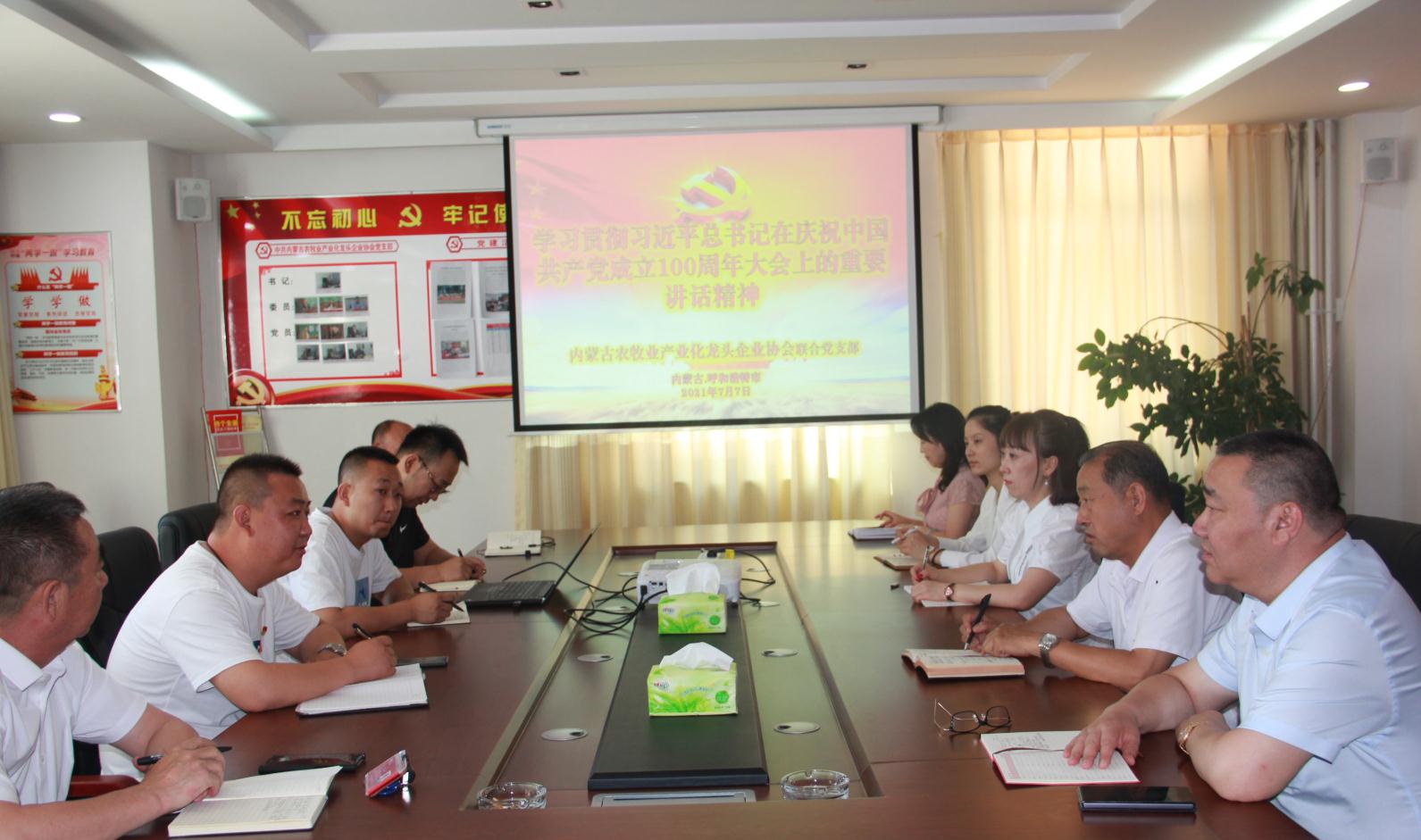 2021年7月7日上午,內(nèi)蒙古農(nóng)牧業(yè)產(chǎn)業(yè)化龍頭企業(yè)協(xié)會(huì)聯(lián)合黨支部書(shū)記李陽(yáng)主持召開(kāi)“學(xué)習(xí)貫徹習(xí)近平總書(shū)記在慶祝中國(guó)共產(chǎn)黨成立100周年大會(huì)上的重要講話(huà)精神”座談會(huì)。協(xié)會(huì)會(huì)長(zhǎng)周勇,執(zhí)行會(huì)長(zhǎng)林永亮,執(zhí)行秘書(shū)長(zhǎng)呼群等所有在呼黨員干部參加會(huì)議。