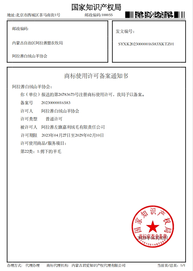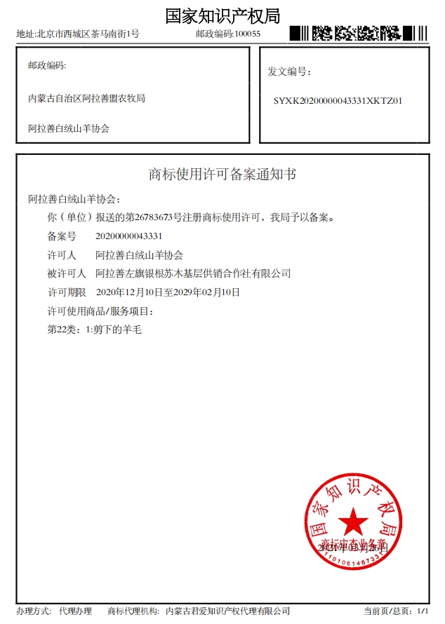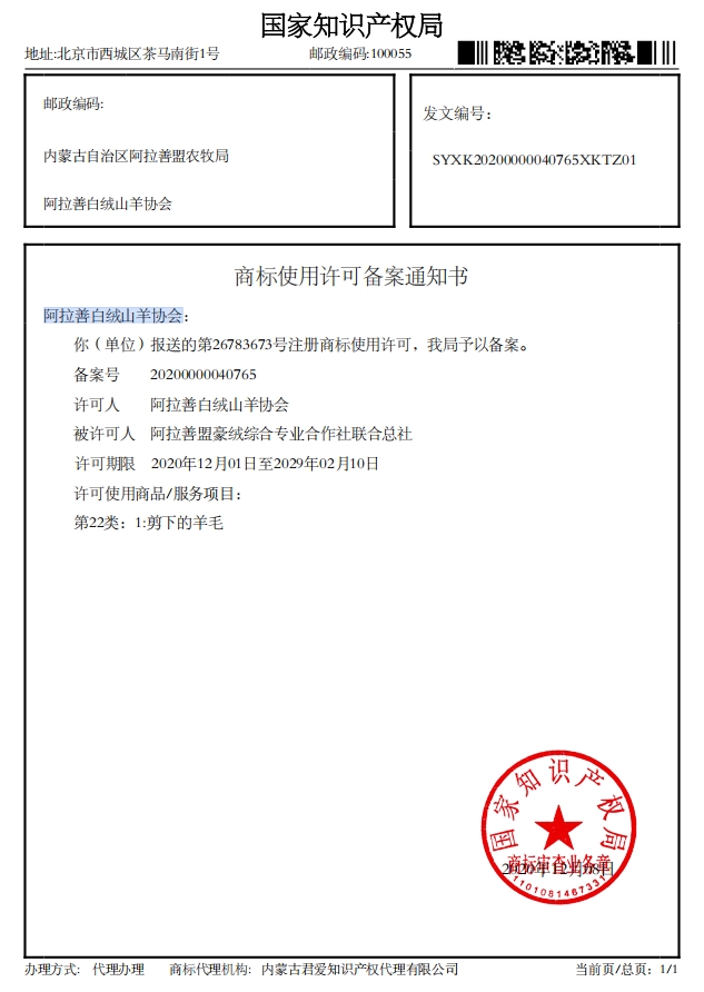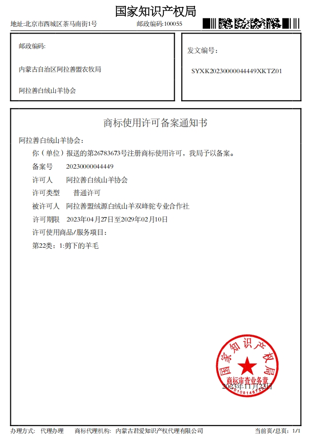 阿拉善白絨山羊協(xié)會(huì)已收到國(guó)家知識(shí)產(chǎn)權(quán)局下發(fā)的4項(xiàng)商標(biāo)使用許可備案通知書