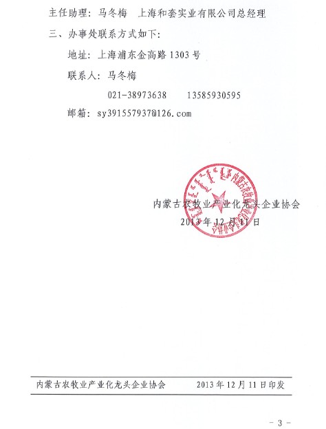 關(guān)于內(nèi)蒙古農(nóng)牧業(yè)產(chǎn)業(yè)化龍頭企業(yè)協(xié)會成立上海辦事處的通知