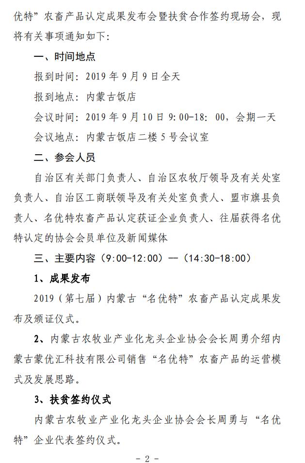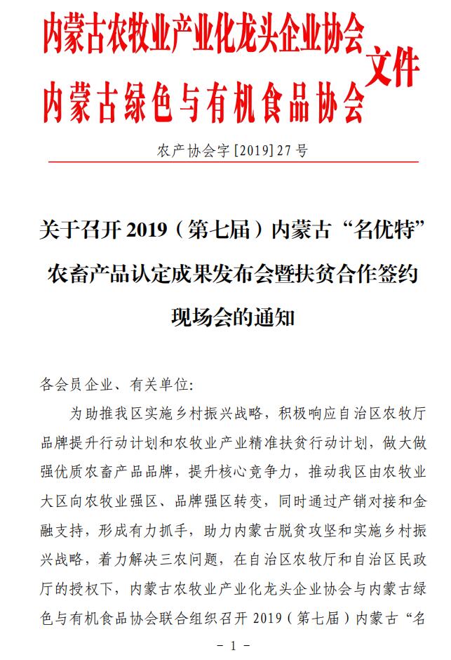 關于召開 2019(第七屆)內(nèi)蒙古“名優(yōu)特” 農(nóng)畜產(chǎn)品認定成果發(fā)布會暨扶貧合作簽約 現(xiàn)場會的通知
