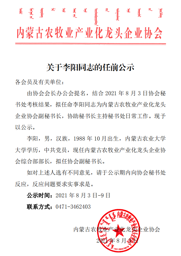 關(guān)于李陽同志的任前公示
