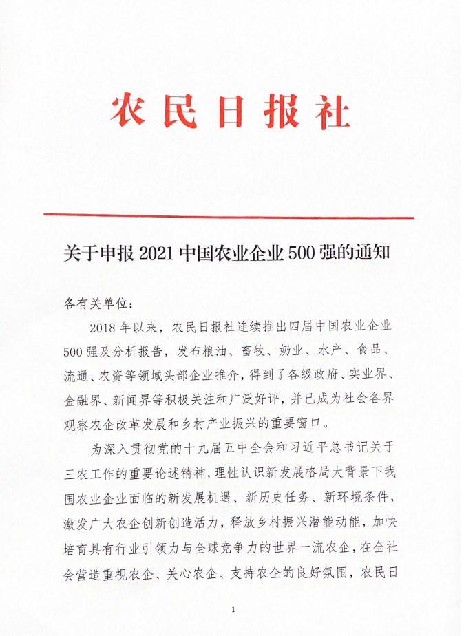轉發(fā):關于申報2021中國農業(yè)企業(yè)500強的通知