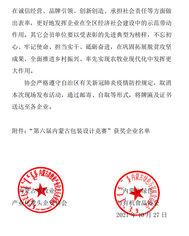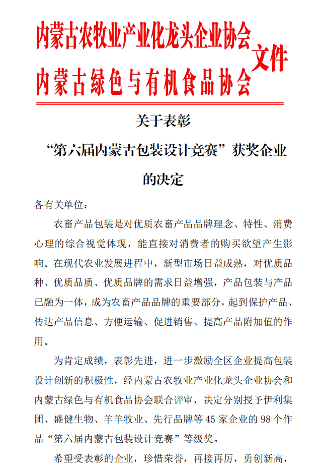 關(guān)于表彰 “第六屆內(nèi)蒙古包裝設(shè)計(jì)競賽”獲獎(jiǎng)企業(yè) 的決定
