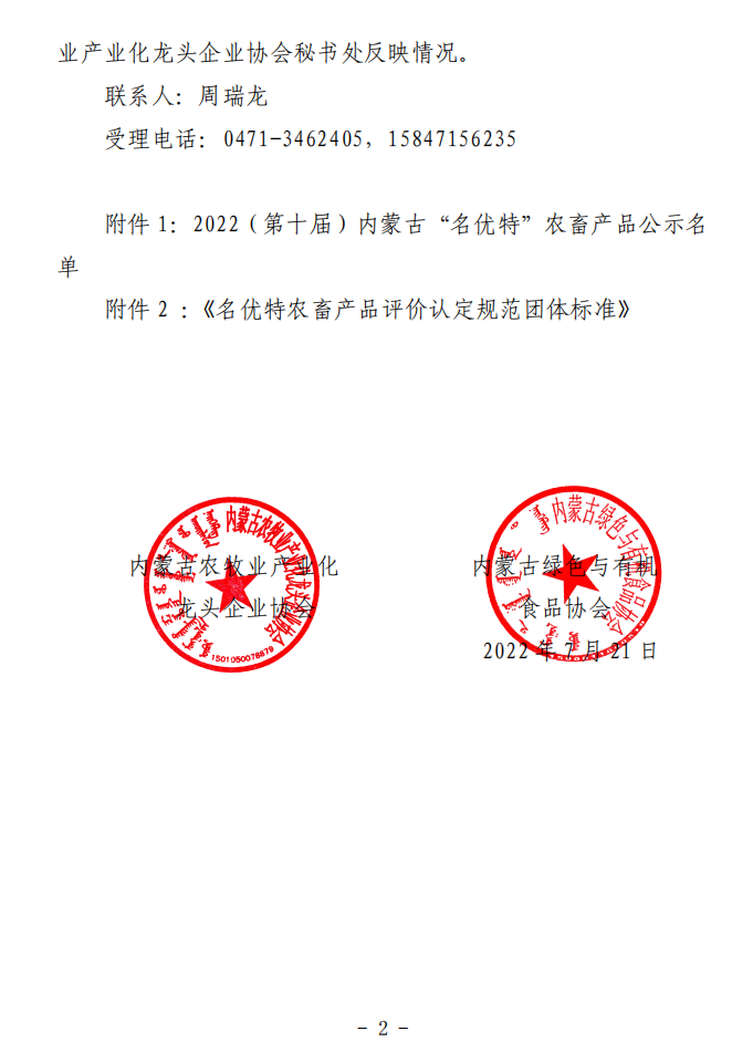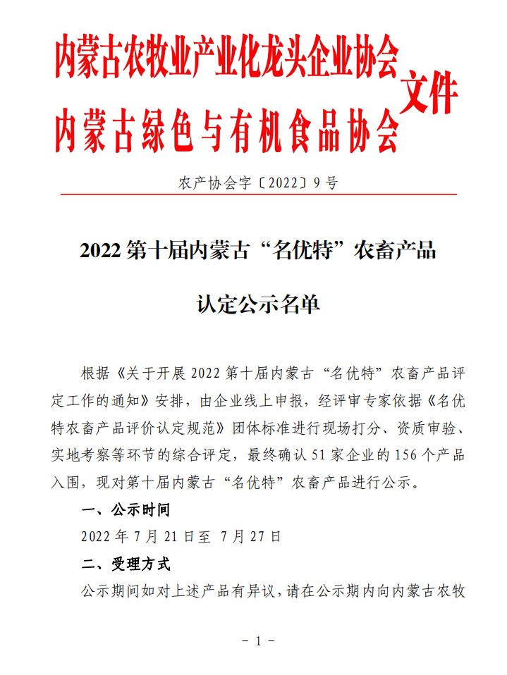 2022(第十屆)內蒙古“名優(yōu)特”農(nóng)畜產(chǎn)品認定公示名單