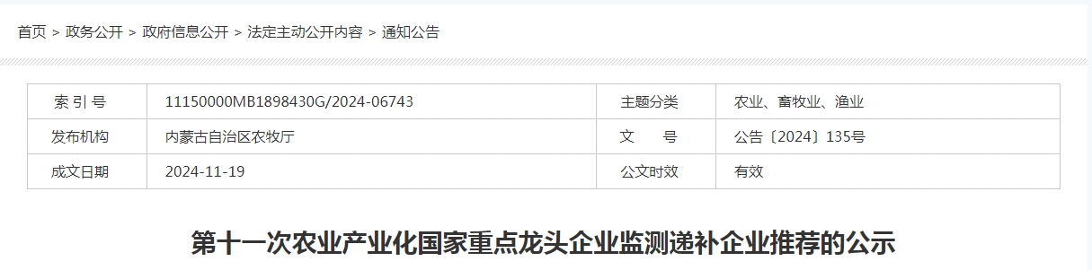 根據(jù)《農(nóng)業(yè)農(nóng)村部辦公廳關(guān)于開展農(nóng)業(yè)產(chǎn)業(yè)化國(guó)家重點(diǎn)龍頭企業(yè)企業(yè)監(jiān)測(cè)工作的通知》(農(nóng)辦產(chǎn)〔2024〕6號(hào))和《農(nóng)業(yè)產(chǎn)業(yè)化國(guó)家重點(diǎn)龍頭企業(yè)認(rèn)定和運(yùn)行監(jiān)測(cè)管理辦法》(農(nóng)經(jīng)發(fā)〔2018〕1號(hào))規(guī)定,立足我區(qū)農(nóng)牧業(yè)產(chǎn)業(yè)發(fā)展實(shí)際,我區(qū)開展了第十一次農(nóng)業(yè)產(chǎn)業(yè)化國(guó)家重點(diǎn)龍頭企業(yè)監(jiān)測(cè)審核和遞補(bǔ)推薦工作。經(jīng)第三方機(jī)構(gòu)審核、專家評(píng)審、相關(guān)九部門單位會(huì)議審查,擬推薦呼倫貝爾農(nóng)墾集團(tuán)有限公司、巴彥淖爾市圣牧高科生態(tài)草業(yè)有限公司、內(nèi)蒙古騎士乳業(yè)集團(tuán)股份有限公司、莫力達(dá)瓦達(dá)斡爾族自治旗沃豐生物質(zhì)新材料有限公司、內(nèi)蒙古阜豐生物科技有限公司5家企業(yè)遞補(bǔ)農(nóng)業(yè)產(chǎn)業(yè)化國(guó)家重點(diǎn)龍頭企業(yè)。