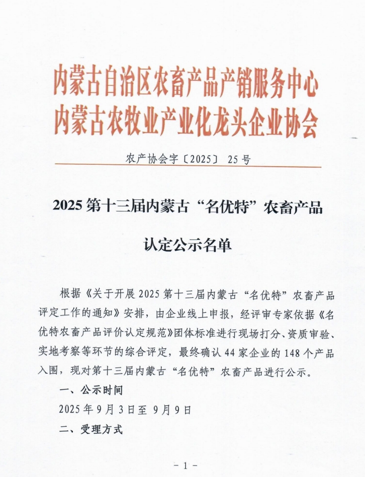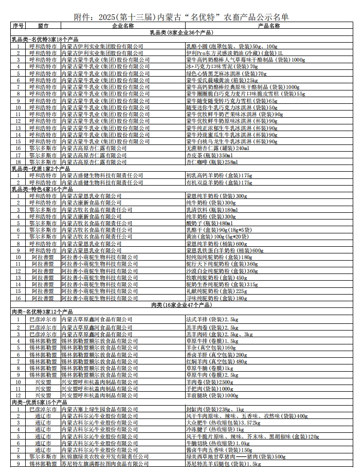 2025第十三屆內(nèi)蒙古“名優(yōu)特”農(nóng)畜產(chǎn)品認定公示名單