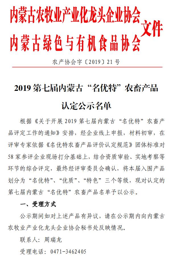 2019第七屆內(nèi)蒙古“名優(yōu)特”農(nóng)畜產(chǎn)品認(rèn)定公示名單