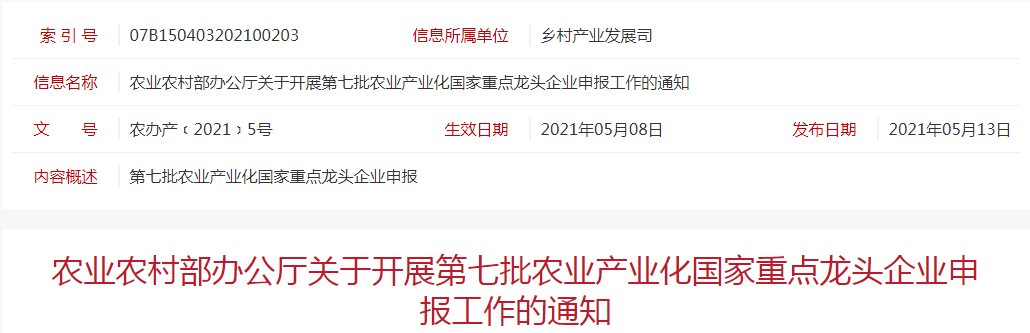 標(biāo)題:農(nóng)業(yè)農(nóng)村部辦公廳關(guān)于開展第七批農(nóng)業(yè)產(chǎn)業(yè)化國家重點(diǎn)龍頭企業(yè)申報(bào)工作的通知
