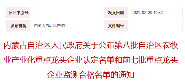 企業(yè)名稱:內蒙古自治區(qū)人民政府關于公布第八批自治區(qū)農牧業(yè)產業(yè)化重點龍頭企業(yè)認定名單和前七批重點龍頭企業(yè)監(jiān)測合格名單的通知
