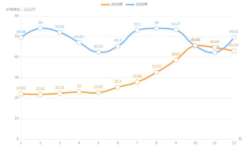 (二)內(nèi)蒙古各大農(nóng)貿(mào)批發(fā)市場(chǎng)2019年和2020年羊肉銷售價(jià)格走勢(shì)如下圖: