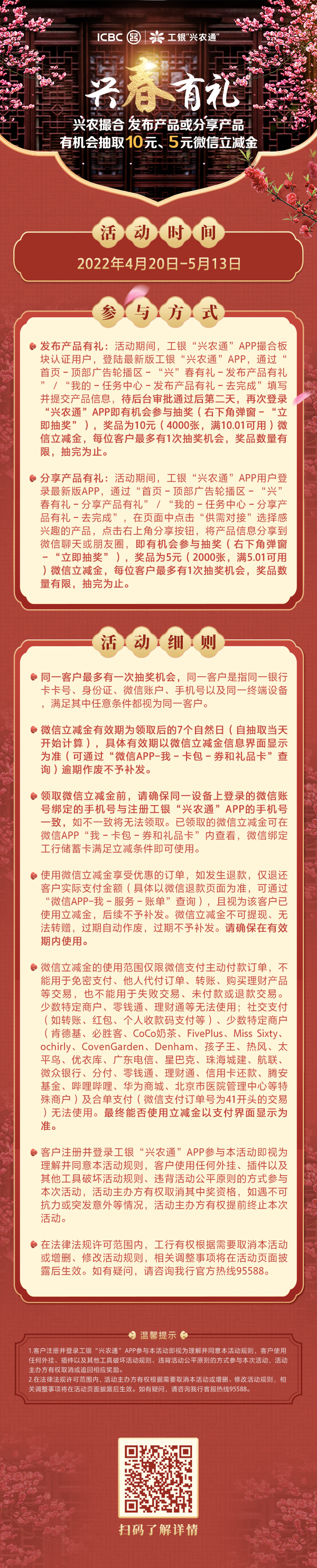 近期,“興農(nóng)撮合”平臺正式入駐工銀“興農(nóng)通”APP,還上線了“興”春有禮營銷活動。入駐平臺后,發(fā)布并分享產(chǎn)品,最高有機(jī)會獲得15元微信立減金!詳情可參考下方長圖: